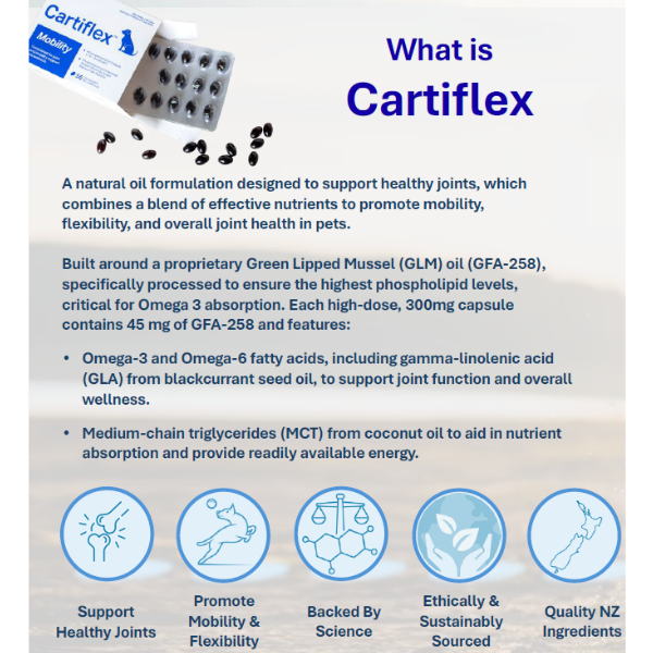 Formulated with GLM oil (GFA-258), flaxseed oil, blackcurrant seed oil, coconut oil, and vitamin E, Cartiflex helps maintain joint comfort, flexibility, and overall wellbeing. Safe for long-term use and ideal for pets needing extra mobility support.