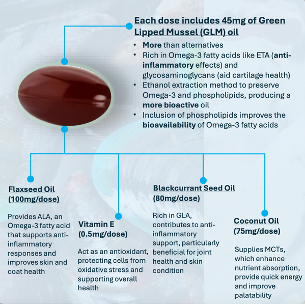 - High-potency GLM oil (GFA-258) for joint comfort and mobility