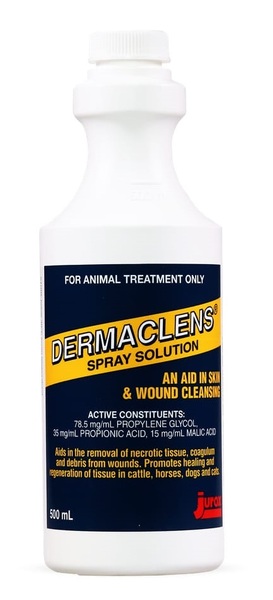 Dermaclens Spray aids in removal of necrotic tissue, coagulum and debris from wounds. Promotes healing and regeneration of tissue in cattle, horses, dogs and cats.