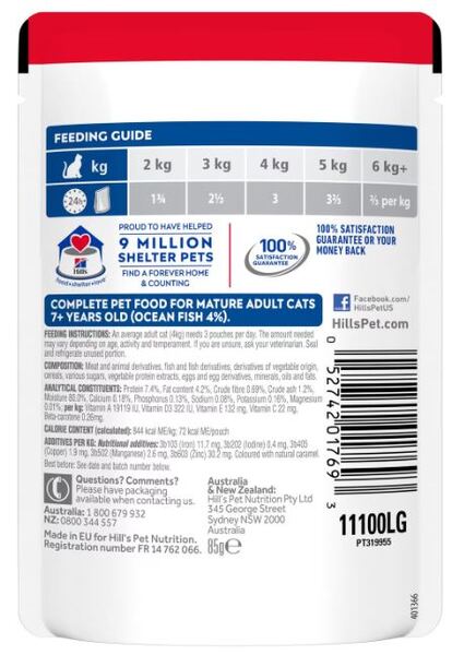 Your cat will love the taste of Hill's Science Diet Mature Adult 7+ Ocean Fish cat food tender chunks in gravy. It has the perfect balance of taste and nutrition supporting graceful ageing in cats.