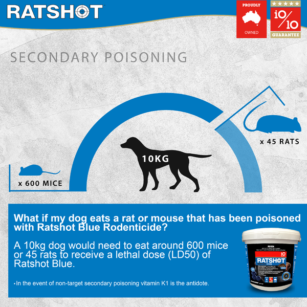 For use in damp or dry situations, in and around buildings, including industrial, commercial, agricultural, public services and domestic structures. It also reduces the risk for secondary poisoning for dogs, cats, birds, native animals, livestock. A 25g mouse will only require 0.4g bait to succumb to the effects whereas a 250g rat will only require 9.0g of bait.