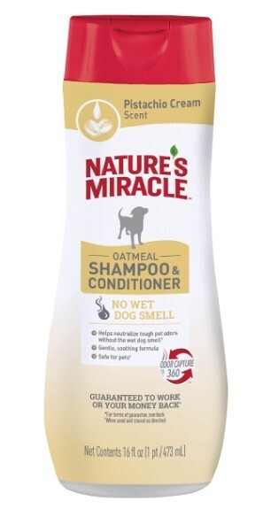 When strong dog odors start to crinkle your nose, it’s time for Nature’s Miracle™ Oatmeal Shampoo and Conditioner! The reformulated shampoo helps neutralize odors and freshens with a light pistachio cream scent, without the wet dog smell. Enriched with colloidal oatmeal, aloe vera and keratin, this shampoo provides moisture and shine and soothes skin for the ultimate grooming experience.
