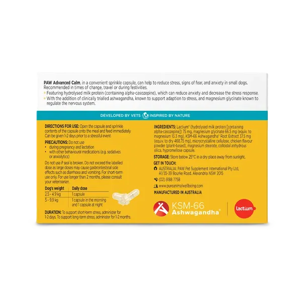 PAW Advanced Calm sprinkle capsules are available in cartons with 30 in each. Open the capsule and sprinkle contents onto the meal and feed immediately. Can be given 1-2 days prior to a stressful event. To support short-term stress, administer for 1-2 days. To support long-term stress, administer for 1-2 months.