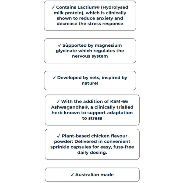 Hydrolysed milk protein (containing alpha-casozepine) 75 mg, magnesium glycinate 66.5 mg (equiv. to magesium 13.3 mg), Withania somnifera (winter cherry, ashwagandha) root extract 37.5 mg (equiv. to dry 468.75 mg), microcrystalline cellulose, chicken flavour powder (plant-based), magnesium stearate, collodial anhydrous silica, hypromellose capsule.