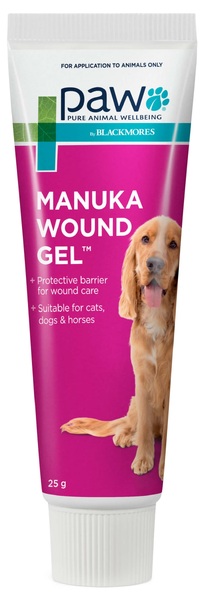 PAW Manuka Wound Gel™ is a sterile medical grade wound dressing made from Leptospermum.sp (Manuka) honey (80%) and natural oils and waxes for wound management. It is ideal for dogs, cats, horses and other companion animals with wounds, burns, grazes and as a general first aid.