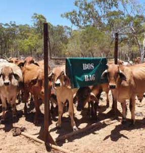 BOS BAGS work best when hung initially in a high traffic area of the paddock or yards, with their base height a few inches below the height of the shoulder of the smallest target animal. Various mounting methods can be used to hang your BOS BAG.