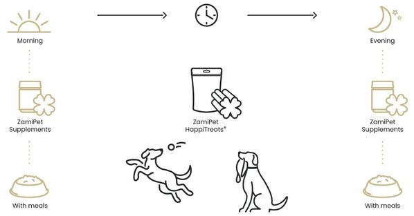 Use ZamiPet premium health supplements with morning and/or evening meals, following the feeding guide provided. For optimum support, use in conjunction with ZamiPet HappiTreats® every day to treat your best friend to a nutritious snack with added health benefits.